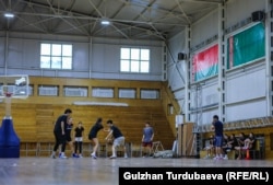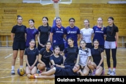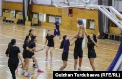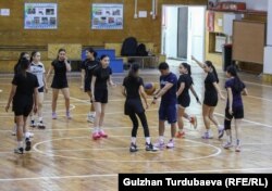 Баскетболчу кыздар машыгуу учурунда. СүрөтGulzhan Turdubaeva (RFE/RL)