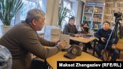 Жолугушуу эркин форматта өткөндүктөн Жыргалбек Касаболот окурмандарынын суроолоруна да жооп берип, ара чолодо ырларынан да окуй калып жатты.